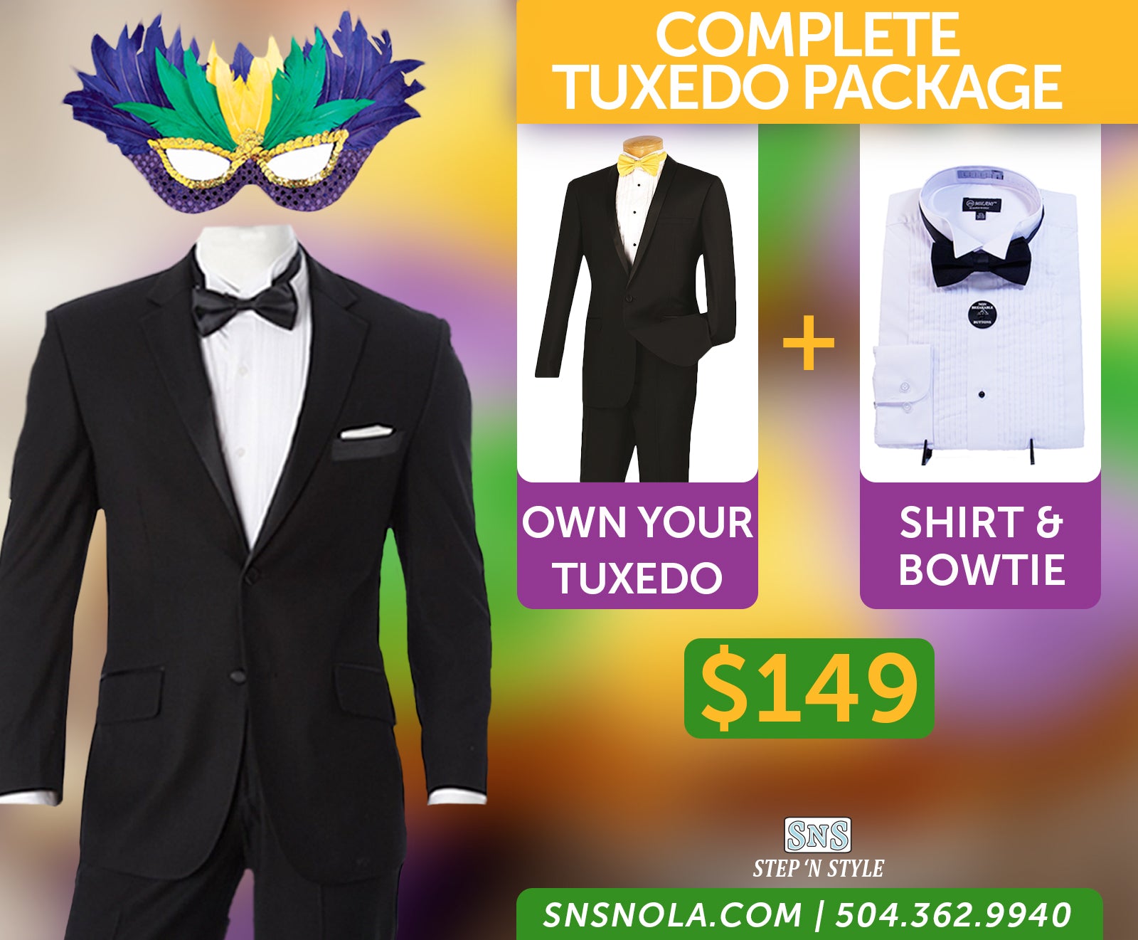 {"id":9803787501868,"title":"Complete Tuxedo Package","handle":"complete-tuxedo-package","description":"\u003ch2\u003eComplete Tuxedo Package includes a Tuxedo with Pants, Shirt and Bowtie\u003c\/h2\u003e\n\u003ch2\u003e\u003cspan style=\"color: #ff2a00;\"\u003eSold In\u003cspan\u003e \u003c\/span\u003eStore Only, But Can be Shipped by Phone Orders.\u003c\/span\u003e\u003c\/h2\u003e\n\u003ch2\u003ePlease Give Us a Call if You Have Any Question: 504 362 9940 \u003c\/h2\u003e\n\u003ch1 style=\"text-align: center;\"\u003e\u003cbr\u003e\u003c\/h1\u003e\n\u003ch2\u003e\u003cbr\u003e\u003c\/h2\u003e\n\u003ctable width=\"100%\"\u003e\n\u003ctbody\u003e\n\u003ctr\u003e\n\u003ctd\u003e\n\u003ch1 style=\"text-align: center;\"\u003eNew Orleans\u003c\/h1\u003e\n\u003ch3 style=\"text-align: center;\"\u003e3771A Gen Degaulle Dr New Orleans, LA 70114 \u003c\/h3\u003e\n\u003ch3 style=\"text-align: center;\"\u003e(504) 362-9940\u003c\/h3\u003e\n\u003ch3 style=\"text-align: center;\"\u003eMonday - Saturday 10:00AM - 6:00PM\u003cbr\u003eClosed Sunday\u003c\/h3\u003e\n\u003c\/td\u003e\n\u003ctd\u003e\n\u003ch4\u003e\u003ca href=\"https:\/\/step-n-style-nola.myshopify.com\/blogs\/news\/shipping-or-in-store-pick-up\" title=\"Step 'N Style Store Pick Up\" target=\"_blank\"\u003e*Store Pick Up Available \u003c\/a\u003e\u003c\/h4\u003e\n\u003ch4\u003e\u003ca href=\"https:\/\/step-n-style-nola.myshopify.com\/blogs\/news\/shipping-or-in-store-pick-up\" title=\"Step 'N Style Store Pick Up\" target=\"_blank\"\u003e\u003ciframe src=\"https:\/\/www.google.com\/maps\/embed?pb=!1m18!1m12!1m3!1d3457.997481859386!2d-90.02108018497408!3d29.92197468192697!2m3!1f0!2f0!3f0!3m2!1i1024!2i768!4f13.1!3m3!1m2!1s0x8620a70b580eb5f1%3A0x4310f0eb54a5f48!2s3771+General+De+Gaulle+Dr%2C+New+Orleans%2C+LA+70114!5e0!3m2!1sen!2sus!4v1516045523434\" width=\"100%\" height=\"100%\" style=\"border: 0;\"\u003e\u003c\/iframe\u003e\u003c\/a\u003e\u003c\/h4\u003e\n\u003c\/td\u003e\n\u003c\/tr\u003e\n\u003ctr\u003e\u003c\/tr\u003e\n\u003c\/tbody\u003e\n\u003c\/table\u003e","published_at":"2026-01-22T09:00:27-05:00","created_at":"2025-01-17T19:22:24-05:00","vendor":"Step N Style Nola","type":"Tuxedo","tags":["balls","black tuxedo","formal wear","guy","man","men","proms","slim","Slim Fit","Tail","Traditional","tuxedo","tuxedo jacket","tuxedos","weddings"],"price":14900,"price_min":14900,"price_max":14900,"available":true,"price_varies":false,"compare_at_price":20000,"compare_at_price_min":20000,"compare_at_price_max":20000,"compare_at_price_varies":false,"variants":[{"id":50478023508268,"title":"In Store Only - Call For Availability","option1":"In Store Only - Call For Availability","option2":null,"option3":null,"sku":null,"requires_shipping":true,"taxable":true,"featured_image":null,"available":true,"name":"Complete Tuxedo Package - In Store Only - Call For Availability","public_title":"In Store Only - Call For Availability","options":["In Store Only - Call For Availability"],"price":14900,"weight":454,"compare_at_price":20000,"inventory_management":"shopify","barcode":null,"requires_selling_plan":false,"selling_plan_allocations":[]}],"images":["\/\/www.snsnola.com\/cdn\/shop\/files\/Complete-tuxedo-package-Social.jpg?v=1769090428","\/\/www.snsnola.com\/cdn\/shop\/files\/traditional_cc67fcb7-3502-457f-8807-0022b17ee062.jpg?v=1769090428","\/\/www.snsnola.com\/cdn\/shop\/files\/MG_6676.jpg?v=1769090428"],"featured_image":"\/\/www.snsnola.com\/cdn\/shop\/files\/Complete-tuxedo-package-Social.jpg?v=1769090428","options":["In Store Only"],"media":[{"alt":null,"id":43275939643692,"position":1,"preview_image":{"aspect_ratio":1.211,"height":1321,"width":1600,"src":"\/\/www.snsnola.com\/cdn\/shop\/files\/Complete-tuxedo-package-Social.jpg?v=1769090428"},"aspect_ratio":1.211,"height":1321,"media_type":"image","src":"\/\/www.snsnola.com\/cdn\/shop\/files\/Complete-tuxedo-package-Social.jpg?v=1769090428","width":1600},{"alt":null,"id":36341736997164,"position":2,"preview_image":{"aspect_ratio":1.0,"height":2048,"width":2048,"src":"\/\/www.snsnola.com\/cdn\/shop\/files\/traditional_cc67fcb7-3502-457f-8807-0022b17ee062.jpg?v=1769090428"},"aspect_ratio":1.0,"height":2048,"media_type":"image","src":"\/\/www.snsnola.com\/cdn\/shop\/files\/traditional_cc67fcb7-3502-457f-8807-0022b17ee062.jpg?v=1769090428","width":2048},{"alt":null,"id":40640322535724,"position":3,"preview_image":{"aspect_ratio":1.0,"height":2048,"width":2048,"src":"\/\/www.snsnola.com\/cdn\/shop\/files\/MG_6676.jpg?v=1769090428"},"aspect_ratio":1.0,"height":2048,"media_type":"image","src":"\/\/www.snsnola.com\/cdn\/shop\/files\/MG_6676.jpg?v=1769090428","width":2048}],"requires_selling_plan":false,"selling_plan_groups":[],"content":"\u003ch2\u003eComplete Tuxedo Package includes a Tuxedo with Pants, Shirt and Bowtie\u003c\/h2\u003e\n\u003ch2\u003e\u003cspan style=\"color: #ff2a00;\"\u003eSold In\u003cspan\u003e \u003c\/span\u003eStore Only, But Can be Shipped by Phone Orders.\u003c\/span\u003e\u003c\/h2\u003e\n\u003ch2\u003ePlease Give Us a Call if You Have Any Question: 504 362 9940 \u003c\/h2\u003e\n\u003ch1 style=\"text-align: center;\"\u003e\u003cbr\u003e\u003c\/h1\u003e\n\u003ch2\u003e\u003cbr\u003e\u003c\/h2\u003e\n\u003ctable width=\"100%\"\u003e\n\u003ctbody\u003e\n\u003ctr\u003e\n\u003ctd\u003e\n\u003ch1 style=\"text-align: center;\"\u003eNew Orleans\u003c\/h1\u003e\n\u003ch3 style=\"text-align: center;\"\u003e3771A Gen Degaulle Dr New Orleans, LA 70114 \u003c\/h3\u003e\n\u003ch3 style=\"text-align: center;\"\u003e(504) 362-9940\u003c\/h3\u003e\n\u003ch3 style=\"text-align: center;\"\u003eMonday - Saturday 10:00AM - 6:00PM\u003cbr\u003eClosed Sunday\u003c\/h3\u003e\n\u003c\/td\u003e\n\u003ctd\u003e\n\u003ch4\u003e\u003ca href=\"https:\/\/step-n-style-nola.myshopify.com\/blogs\/news\/shipping-or-in-store-pick-up\" title=\"Step 'N Style Store Pick Up\" target=\"_blank\"\u003e*Store Pick Up Available \u003c\/a\u003e\u003c\/h4\u003e\n\u003ch4\u003e\u003ca href=\"https:\/\/step-n-style-nola.myshop